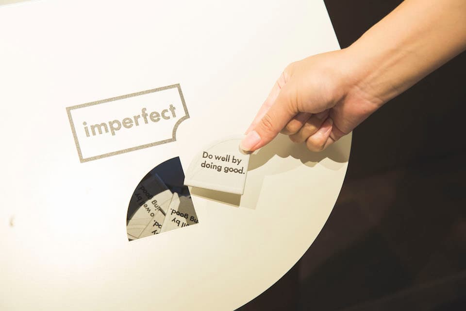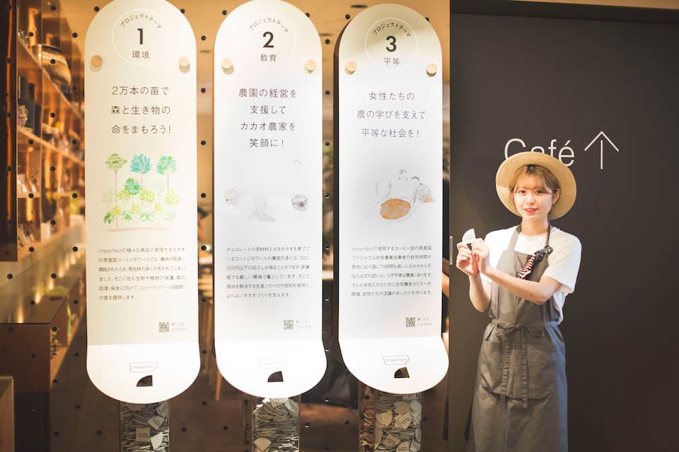 表参道ヒルズ同潤館の一階にある、ウェルフードマーケット&カフェ「imperfect表参道」。こだわりのチョコレートやナッツ、アイスクリームにコーヒーなどを提供しているお洒落なお店ですが、キーワードは「いいことをして世界と社会をよくしていこう」。今回は、この場所で誰もが参加できる「世界と社会をよくする」活動の一つを紹介します。(記者・リョウコ)