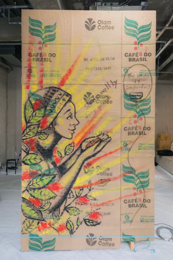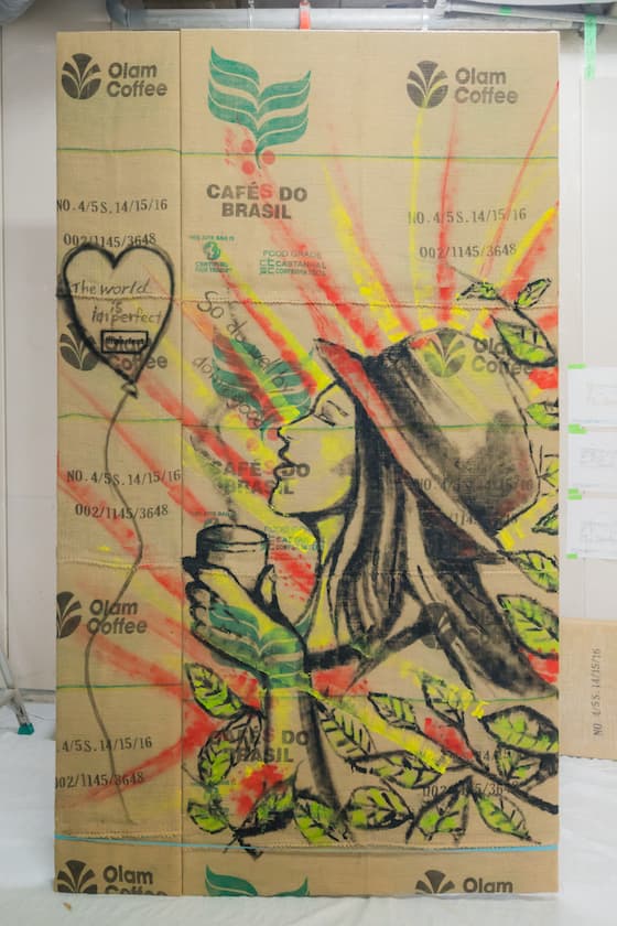 「おいしいとうれしいをつなぐ」をテーマにしたウォールアートのキャンバスは、imperfect 表参道で取り扱うコーヒーの麻袋を再利用。