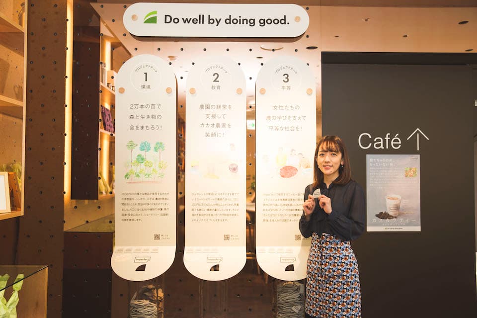 例えば、私たちのフラッグシップストアであるimperfect表参道の店舗では、ナッツ、チョコレート、コーヒーなどの商品を購入してくれたお客様に投票チップをお渡ししています。imperfect表参道の店内では、生産者の自立支援を支えたり、環境保全を実現するための3つのテーマからなるプロジェクトを紹介しているのですが、お客様にはどれかひとつ、ご自身が応援したいと思うテーマにチップを投票していただいています。そして投票の結果をもとに、imperfectとして現地でプロジェクトを実施します。これが、私たちが実施している「Do well by doing good.」活動です。